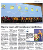 Leaders meet to preserve cultureMayors and representatives of 44 cities from 16 countries gathered at a forum held in Nanjing to share their experiences in preserving cultural heritages. The forum is part of the five-day 2010 World Historical and Cultural Cities Expo.