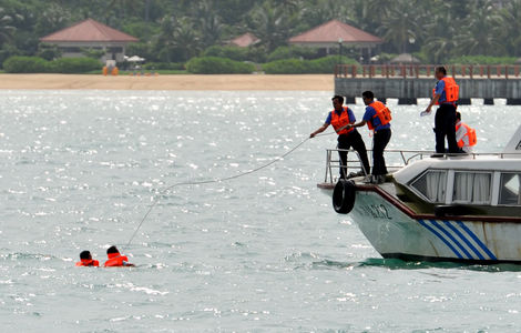 Two rescue ships put out ship "fire" during a maritime rescue exercise in Sanya, June 26, 2012.