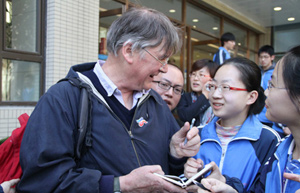 Tim Hunt, 2001 Nobel Laureate in Physiology or Medicine, gave an inspiring lecture to students at Dalian No.8 High School on Wednesday in Dalian, Northeast China's Liaoning province.