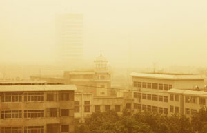 Buildings are shrouded in sand and dust in Turpan in the Xinjiang Uygur autonomous region, April 28, 2011. A cold front whipped up sandstorms in Turpan city, lowering visibility to less than 30 meters.