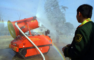 The robot is a substitute for firefighters to put out fires at short range and discharge smoke. A tank-like device, it can be operated 150 meters away.