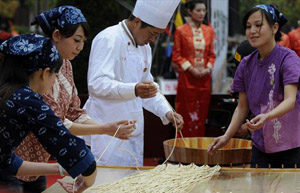 A 1,704-meter-long stretch of noodle is displayed in Weishan county of Dali Bai autonomous prefecture in Southwest China’s Yunnan. The noodle was made within 25 minutes and broke the Guinness World Record as the longest handmade noodle.
