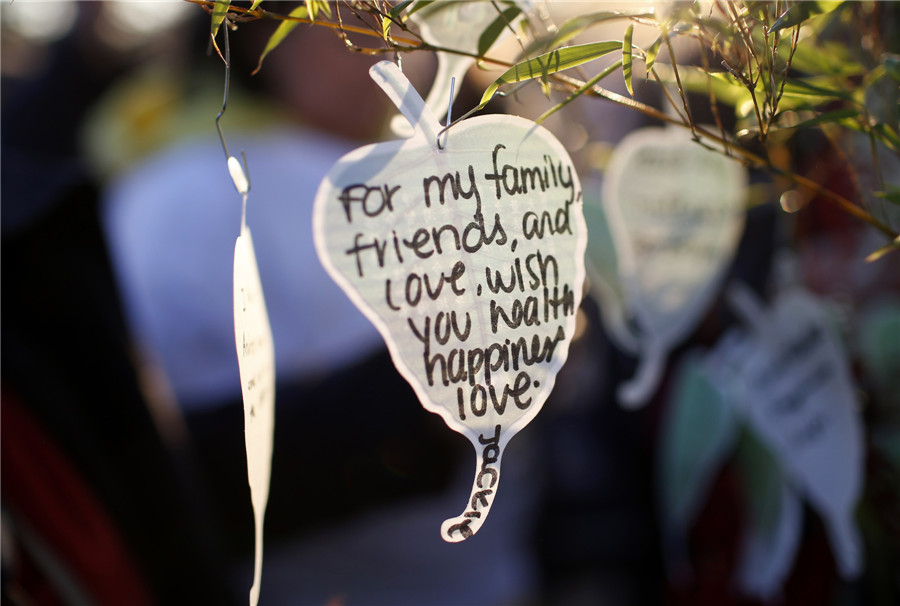 A message is attached to a tree of prayer notes during an event to commemorate the one-year anniversary of Hurricane Sandy in the Staten Island borough of New York City, October 29, 2013. [Photo/Agencies]
