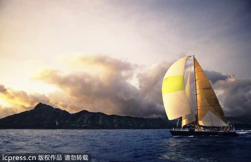Top one: Hawaii, Oahu, Transpacific winner "Chance" sailboat on ocean near Diamond Head.[Photo/icpress.cn]