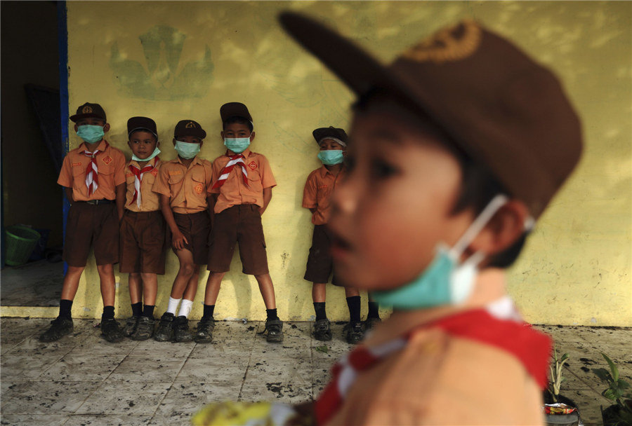 Students wearing masks stand in front of their classroom after Mount Sinabung erupted at Naman Teran village in Karo district, Indonesia's North Sumatra province, January 11, 2014. [Photo/Agencies]