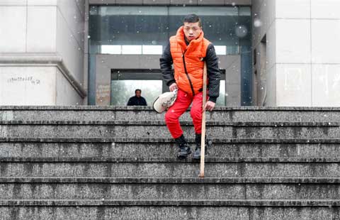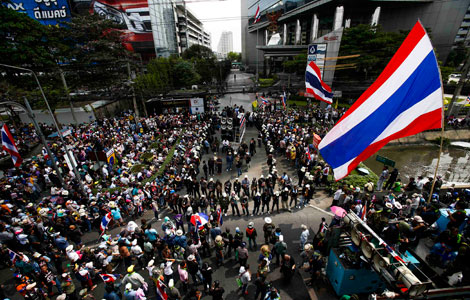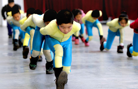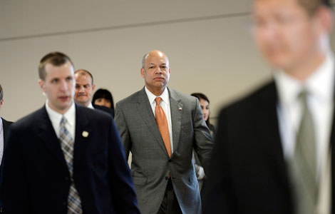 Arsenal's Yaya Sanogo (L) reacts in front of Bayern Munich's Thomas Muller (C) during their Champions League round of 16 first leg soccer match at the Emirates Stadium in London, Feb 19, 2014. [Photo/Agencies]