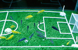 A child watches fish swim over a mini soccer field during a "fish soccer match" event at the Shanghai Ocean Aquarium, ahead of the 2014 World Cup in Brazil, in Shanghai June 12, 2014.