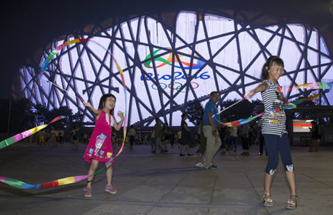 The Rio Olympic emblem was lit in Beijing National Stadium, also known as the Bird's Nest, on the night of Aug 4 to celebrate the upcoming opening ceremony of the Rio 2016 Olympic Games.