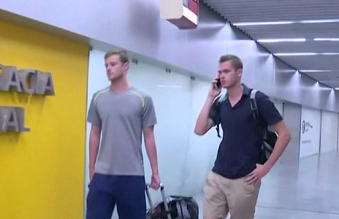 Brazilian police stopped two US Olympic swimmers from boarding a flight home on Wednesday to question them about how they and two team mates were robbed at gunpoint in Rio de Janeiro.