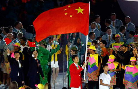 The Chinese delegation, led by flag bearer Lei Sheng, marched into the Maracana Stadium in the Rio Olympic Games opening ceremony on Friday.