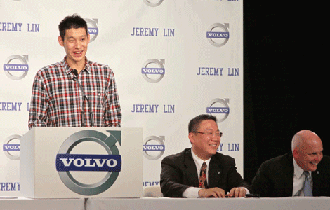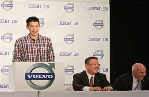Jeremy Lin announces his endorsement deal with Volvo in a news conference in New York on Monday. Freeman Shen (center), senior vice-president of Volvo Car Corp, and John Maloney, president & CEO Volvo Cars of North America, were in attendance.