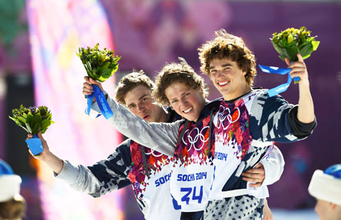 US finalists second placed Gus Kenworthy, winner Joss Christensen and third placed Nicholas Goepper (L-R) celebrate on podium after the men's freestyle skiing slopestyle finals at the 2014 Sochi Winter Olympic Games in Rosa Khutor, February 13, 2014. [Photo/Agencies]