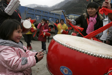Updated: 2009-01-24 11:34 Local villagers play drums during a rehearsal for celebrations of the Chinese Lunar New Year, January 22, 2009, in Yingxiu Town, Wenchuan County, the epicenter of the May earthquake in Southwest China's Sichuan Province. Millions of people living in China's quake-affected areas make preparations for the upcoming Lunar New Year, which falls on January 26. [CFP] ![]() ![]() ![]() |