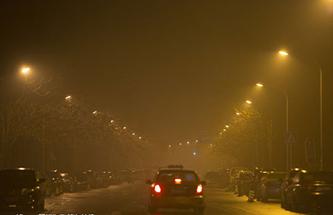 Pink sky is seen in Nanjing on a heavily smoggy day. [Photo/IC] |