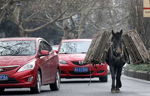 The mule, loaded with bamboo rafts, startled pedestrians and passing vehicles, as it jaywalked on the busy roads in Hangzhou, East China's Zhejiang province without its owner's company, zjol.com.cn reported on Thursday.