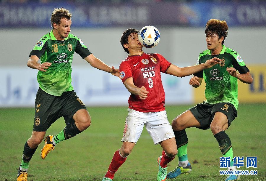3月18日,廣州恒大隊球員埃爾克森(中)與全北現(xiàn)代隊球員拼搶。當日,在2014年亞冠聯(lián)賽G組第3輪比賽中,廣州恒大隊主場以3比1擊敗全北現(xiàn)代隊。新華社記者劉大偉攝