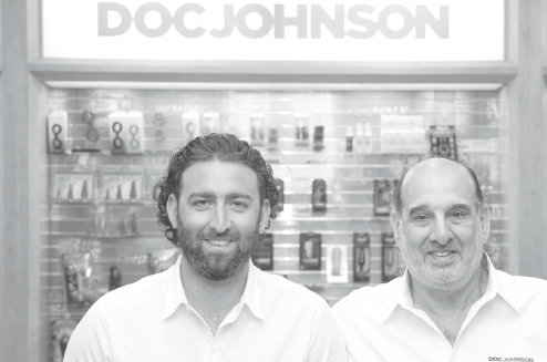 Ron Braverman (right) and his son Chad Braverman, owners of Doc Johnson, a California-based sex toy company, pose for a photo in their factory showroom in Los Angeles. [Photo provided to China Daily]
