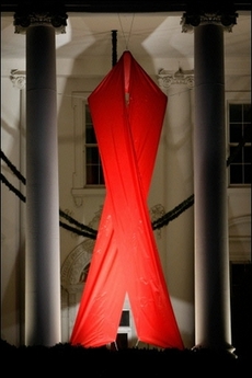 An AIDS ribbon hangs from the North Portico of the White House. [Agencies]