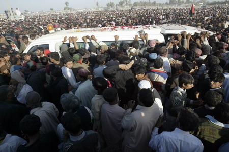 Supporters of assassinated opposition leader Benazir Bhutto crowd around an ambulance carrying her body during her funeral outside their ancestral mausoleum in Garhi Khuda Bukhsh near Naudero December 28, 2007. [Agencies]