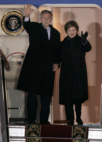 Ukraine put on a formal welcoming ceremony for Bush on Tuesday before his meetings with President Viktor Yushchenko at the Presidential Secretariat. The playing of national anthems and parade of high-stepping military men in long, belted dress coats with fur collars was typical of the greetings Bush gets all over the world. But these arrival rites took on particular importance here because of Ukraine's drive to join NATO. Bush stopped in Ukraine as a show of support, intending to praise its democratic reforms and help make the case for NATO membership. Arriving late Monday night, Bush was presented with a traditional greeting of bread and salt, while his wife, Laura, was given a bouquet of flowers. He and Yushchenko scheduled a news conference Tuesday following their talks. Ukraine had long flirted with joining NATO, but it started taking real steps toward meeting the alliance's military and political standards only after Yushchenko became president in the wake of the 2004 street protests, called the Orange Revolution.
