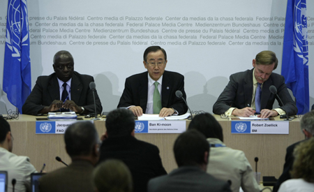 The international bodies called on countries not to restrict exports of food to secure supplies at home, warning that could make the problem worse. "We consider that the dramatic escalation in food prices worldwide has evolved into an unprecedented challenge of global proportions," the United Nations said in a statement. This had become a crisis for the world's most vulnerable people, including the urban poor, it said after a meeting of 27 international agency heads in the Swiss capital, Berne, to chart a solution to food price rises that have caused hunger, riots and hoarding in poor countries. "Though we have seen wheat prices fall over the last few days, rice and corn prices are likely to remain high, and wheat relatively so," World Bank President Robert Zoellick told a joint news conference.