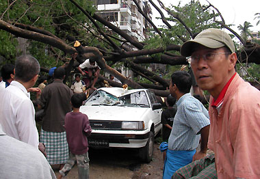 Men assess damage caused by a cyclone in central Yangon on May 4, 2008. [Agencies]