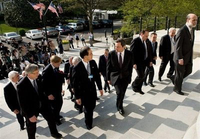 G7 central bank governors and finance ministers including US Federal Reserve Chairman Ben Bernanke (R) leave after posing for a group photo outside the US Treasury in Washington, DC, April 2008.  [Agencies]