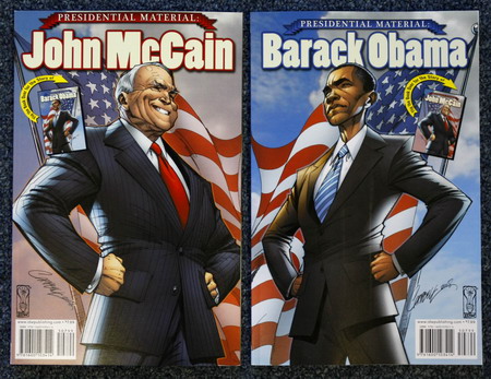 The comic book biographies of US Democratic presidential nominee Senator Barack Obama and US Republican presidential nominee Senator John McCain are seen at their publishers office in San Diego October 6, 2008. The life stories of US presidential candidates John McCain and Barack Obama hit comic book stands on October 8 -- and the company behind the illustrated bios hopes plenty of adults will buy them. Picture taken October 6, 2008. [Agencies]