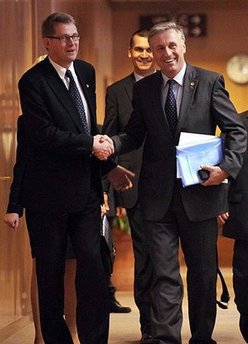 Finland Prime minister Matti Vanhanen (L) shakes hands with his Czech countrepart Mirek Topolanek (R) as they arrive for an informal working lunch meeting of EU heads of state and governments in Brussels. An international summit next week in Washington should mark only the beginning of a global revamp of the financial order, EU leaders agreed Friday, calling for a second meeting in early spring.[Agencies]