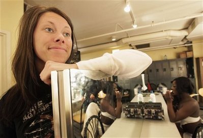 Rebecca Brown, 29, talks about the economics of being a stripper as Eva Stone, background, works on her makeup before dancing at the Pink Monkey gentlemen's club in Chicago on Feb. 19, 2009. [Agencies]