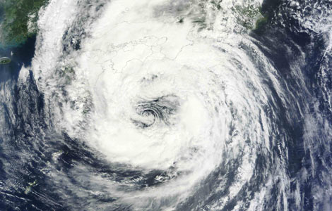 A Moderate Resolution Imaging Spectroradiometer (MODIS) image from NASA's Terra satellite shows tropical storm Talas around 345 km (185 nautical miles) south-southwest of Kyoto on its northward journey over Japan, Sept 2, 2011. [Photo/Agencies] |