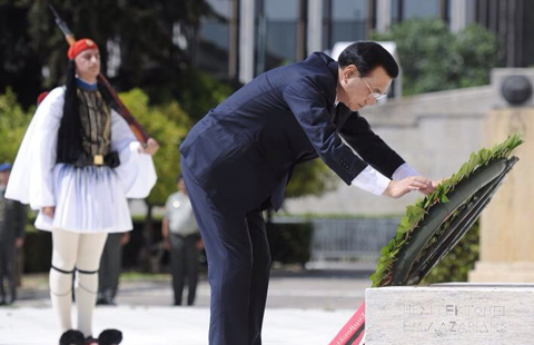 Chinese Premier Li Keqiang places a wreath at the Tomb of Unknown Soldier in Athens, Greece, on June 19, 2014.