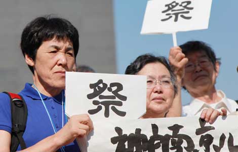Japanese delegates lay a wreath for Nanjing Massacre victims at the Memorial Hall of Victims in Nanjing Massacre by Japanese Invaders, in Nanjing, East China's Jiangsu province, Aug 15, 2013.