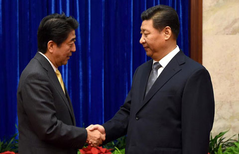 President Xi Jinping called on Japan to honor its official remorse about wartime history and embark on trust-building measures in a meeting with Japanese Prime Minister Shinzo Abe on Monday.