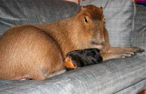 This photo released by Melanie Typaldos shows Caplin her pet capybara and her daughters pet guinea pig Neptune.