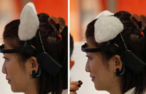Strap-on artificial cat ears have abilities to wiggle, twitch, perk up or flop down by responding to user's brainwaves.
