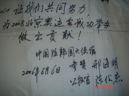 參贊邢海明先生和新聞官陳俊杰先生并為本次活動留言“讓我們共同努力,為2008北京奧運會成功舉辦做出貢獻!”,最后參贊陳海明先生并與我合影留念。