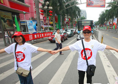 2009年6月20日上午,在深圳華強(qiáng)路與振興路口,一群身穿前后印有“?!被颉靶小弊职咨玊恤的勸導(dǎo)人員,隨著紅綠燈的變化組成人體警示線。